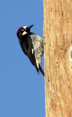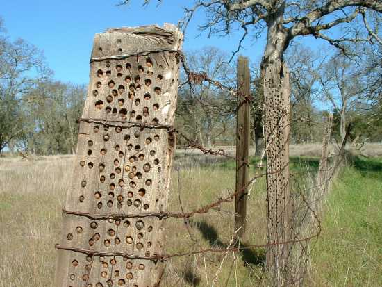 Frank Falusi offered this photo of a fence that burned down in the early 2000s. It shows woodpeckers had drilled hundreds of acorns into the fence.